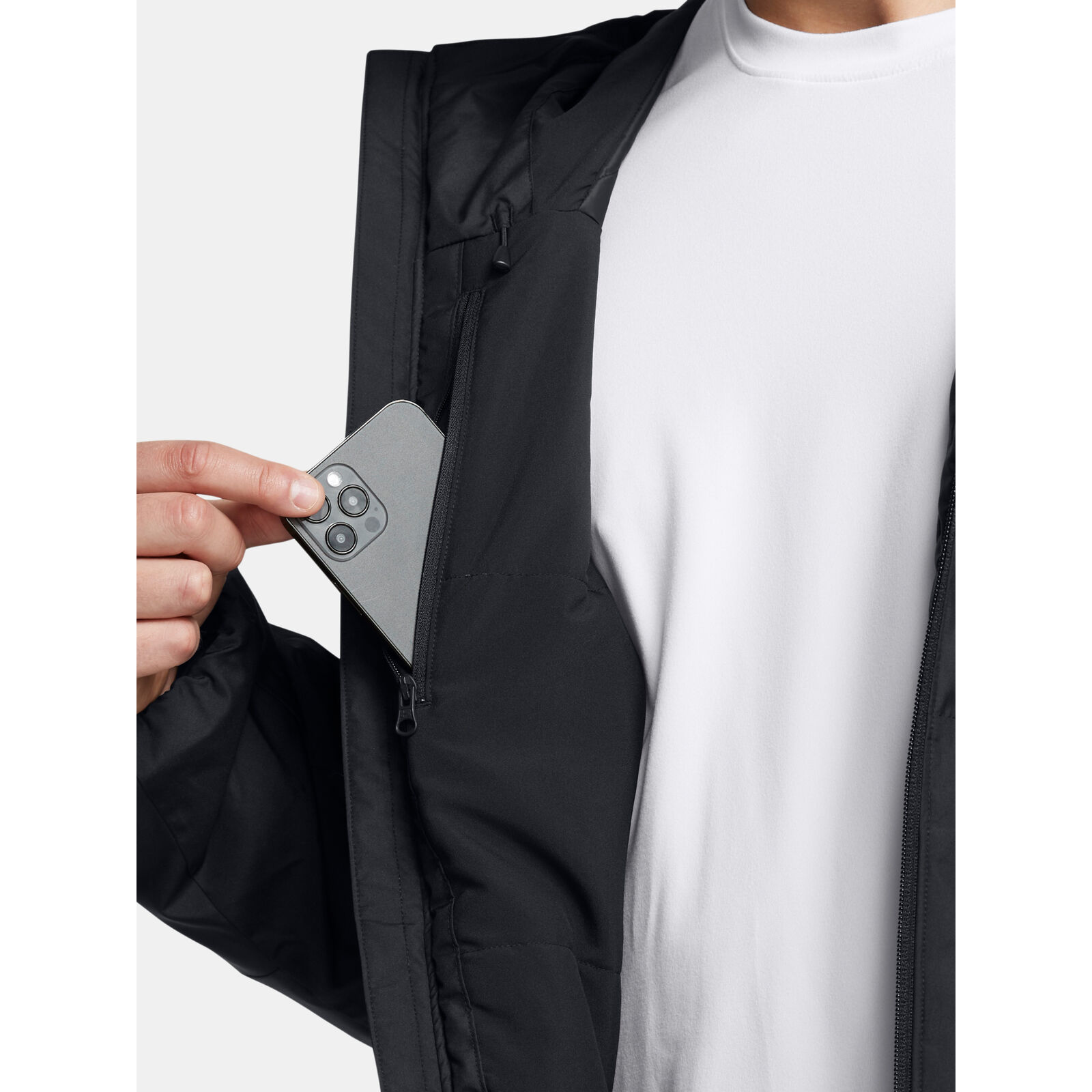 Az UA Storm technológia taszítja a vizet anélkül, hogy csökkentené a légáteresztõ képességet.A könny szövet kiváló kényelmet és tartósságot biztosít.Teljes felület 80 g-os szintetikus szigetelés a melegért, felesleges térfogat nélkül.Biztonságos, cipzáras kézzsebek puha trikó béléssel, amely melegen tartja a kezeket, és cipzáras mellzseb.Rugalmas mandzsetták, belsõ alsó szegély állítás és állítható kapucni a biztonságos illeszkedésért.Fluortól mentes víztaszító kezelést használ.